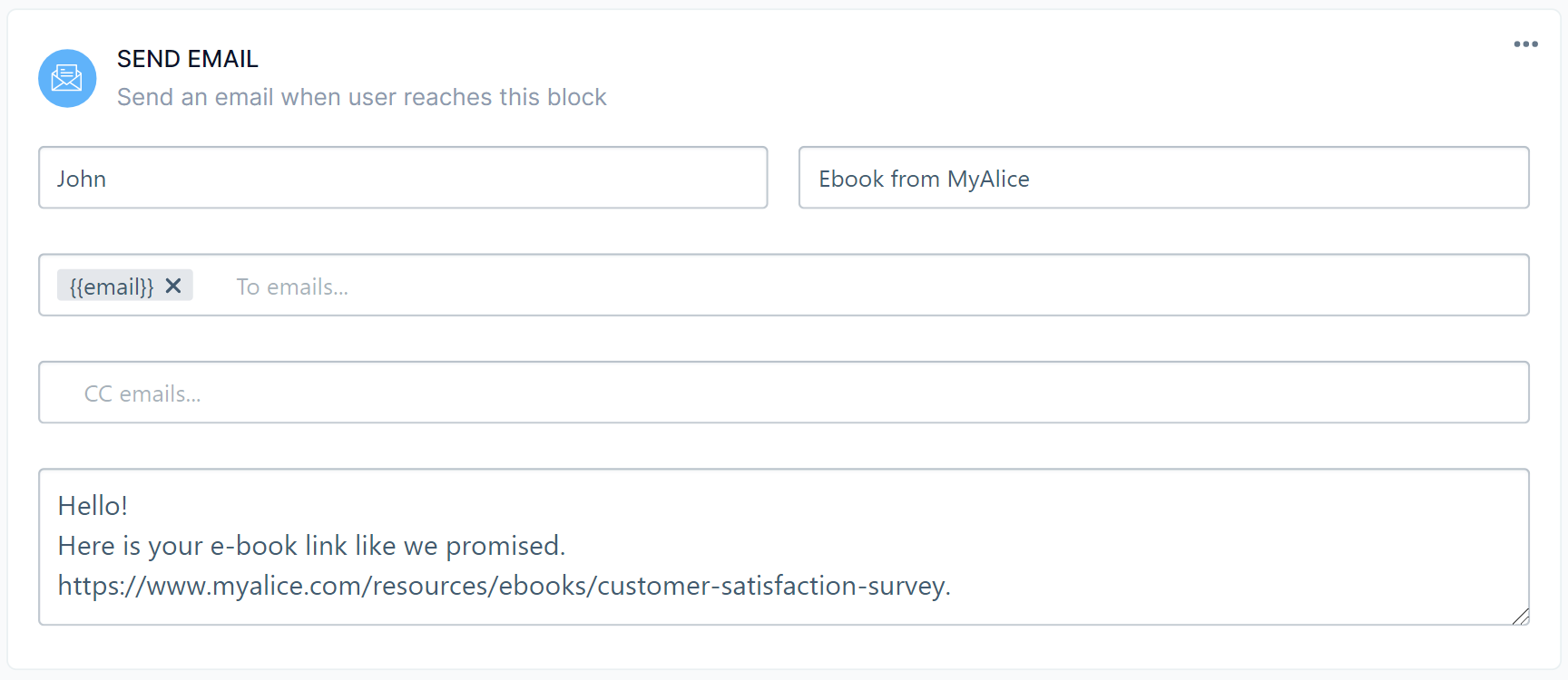Send email block is used to send emails to your customers. One use case is sending e-books.