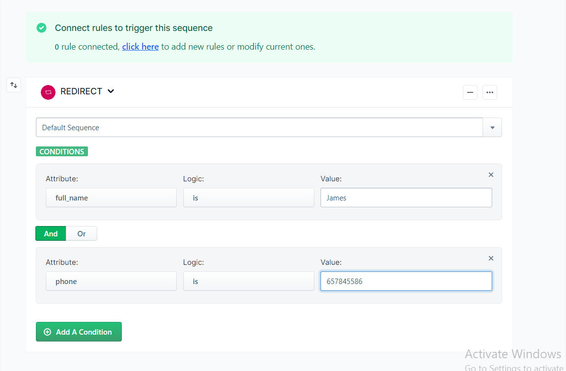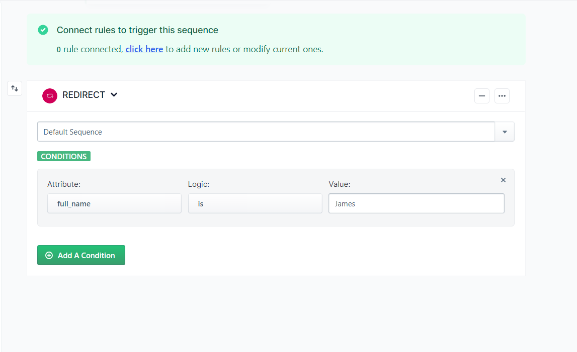 In the screenshot above, the condition set is ' If someone's full name is James, take him to the Default Sequence'