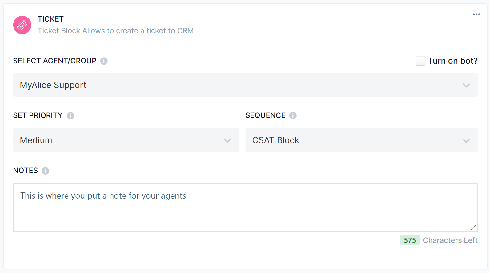Simply put, ticket blocks transfer the conversation from a chatbot to a human agent.