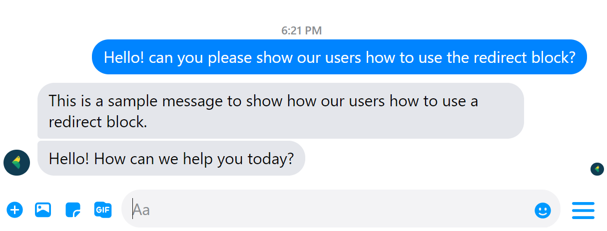 Use redirect blocks to take the user from one sequence to another without having to press on a button or put in a keyword. In the example below, we redirect our users to a Hello Sequence after showing the text in the Text Block. This block is usually placed at the end of a sequence.