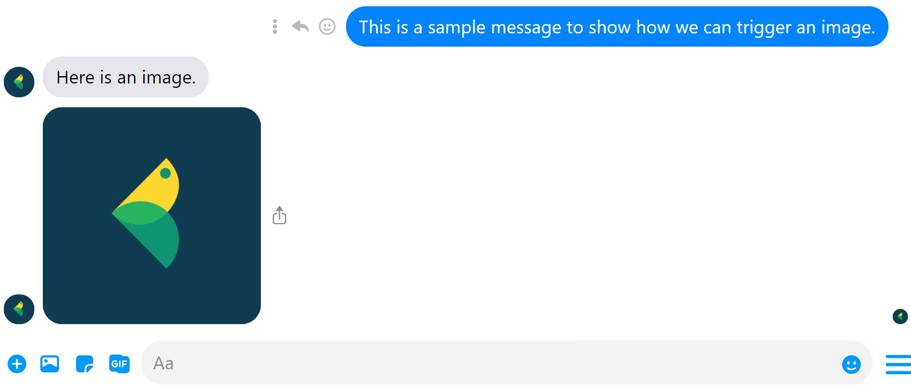 Use image/GIF block to share images with your customers to make your conversation more humane. The supported formats are JPG, JPEG, PNG, and GIF. You can upload images from either your desktop or an API.