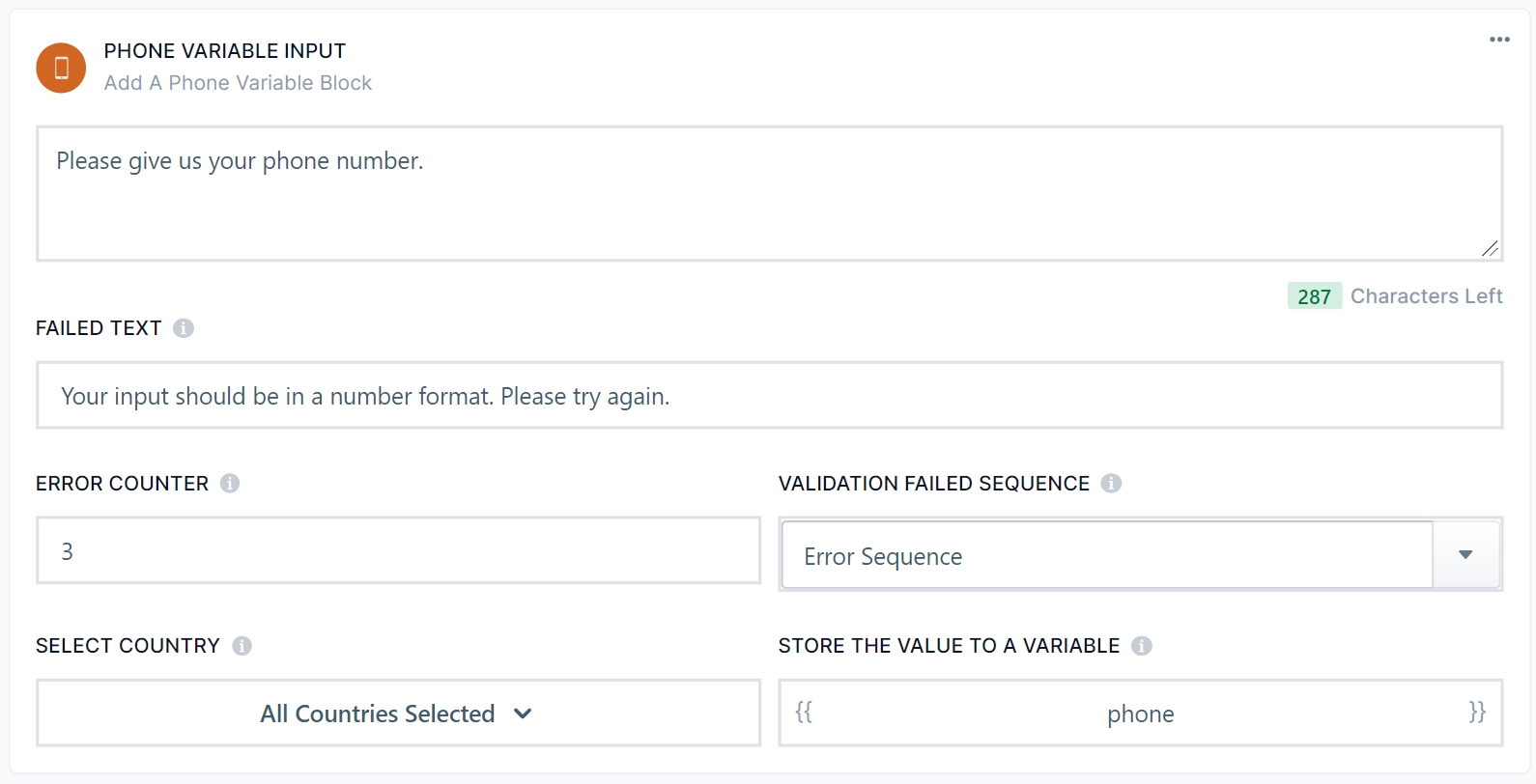 Use these blocks to collect customer user information, phone number, or email address and store the information in your CRM.