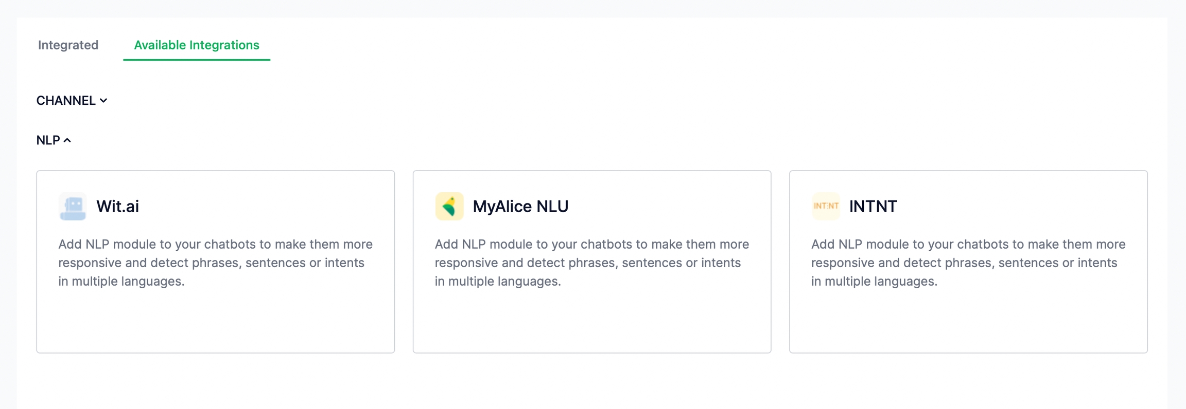 Under Available Integrations > NLP, select MyAlice NLU.
