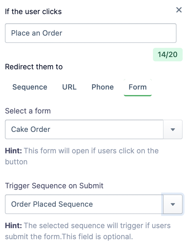 Now click on Create a Button. We name the button "Place an Order". If the user clicks on the button, they will be redirected to our newly created Datalab form called Cake Order. If the user submits, they will be redirected to the Order Placed Sequence.