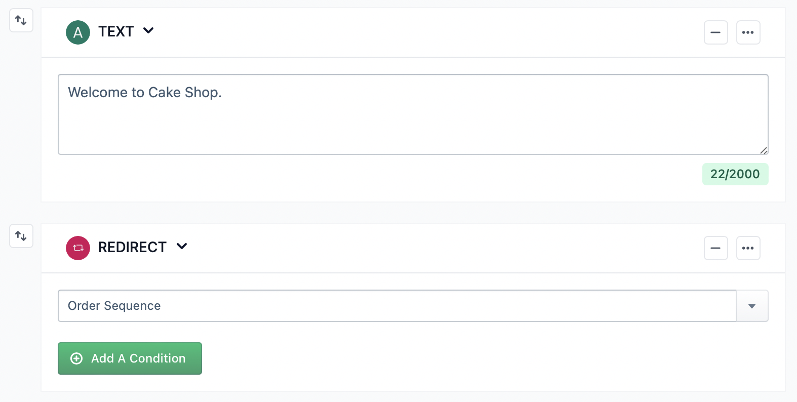 Now, we create a sample welcome message and place the Redirect block to redirect users to a new sequence called Order Sequence.