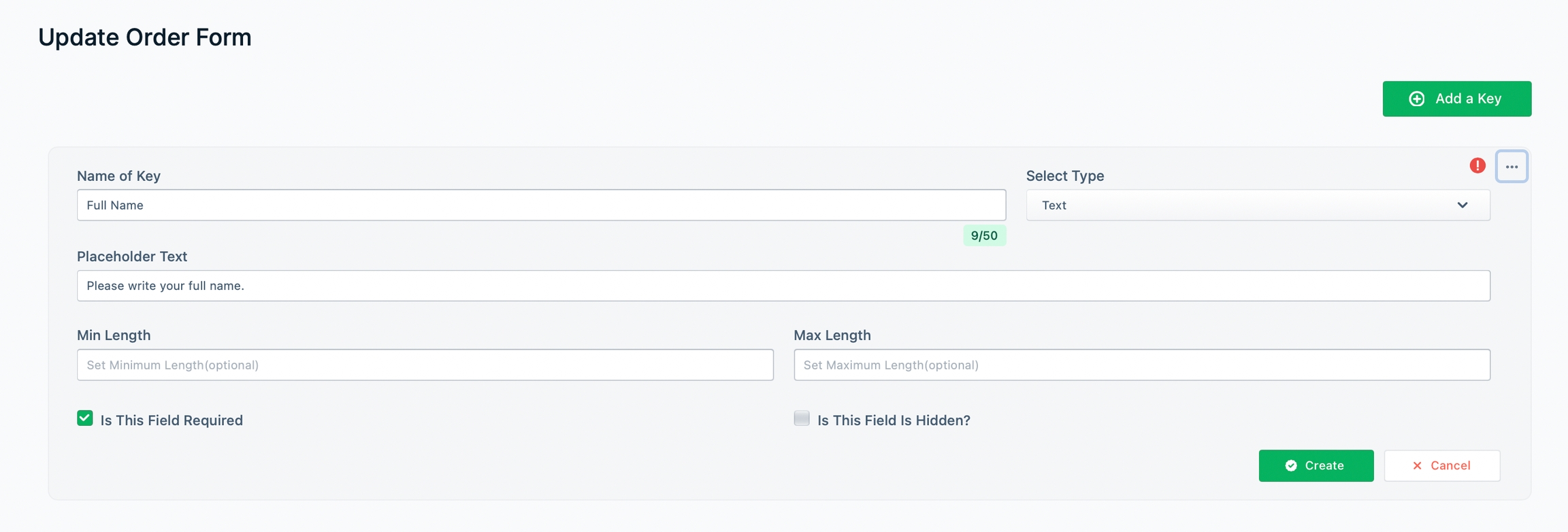 Each key has a placeholder text underneath it. For example, the placeholder text for the Full Name key can be "Please write your full name."