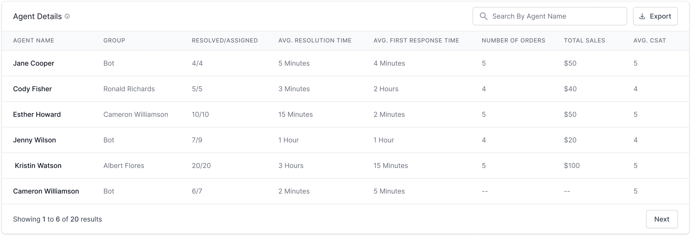 You can also find individual agent details at the bottom of your page. From here, you can search and track individual agent performance or export the entire sheet in an Excel file.
