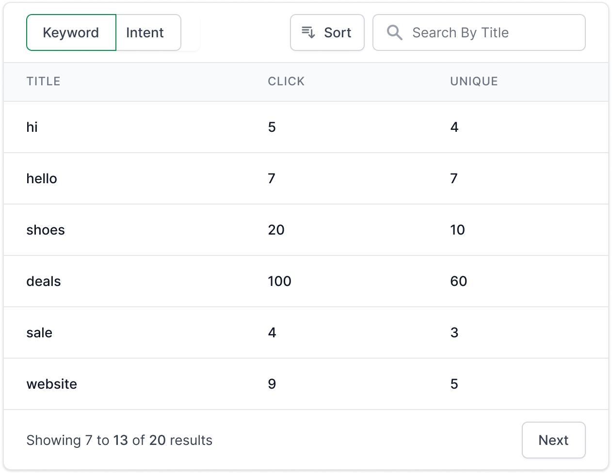 This table shows which keywords or intents have been triggered the most by your users and how many unique customers have used them.