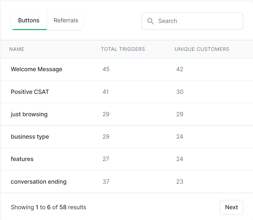 This table shows which buttons, sequences, or referral links have been triggered the most by your users and how many unique customers have used them.