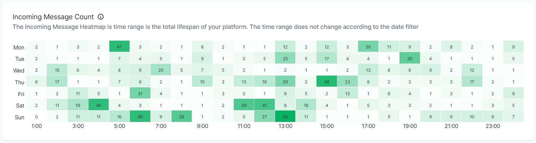 The Incoming Message count is a heatmap to identify the time your platform gets the most user interactions. Simply put, you can pinpoint your busy hours of the day or the busy days of the week.