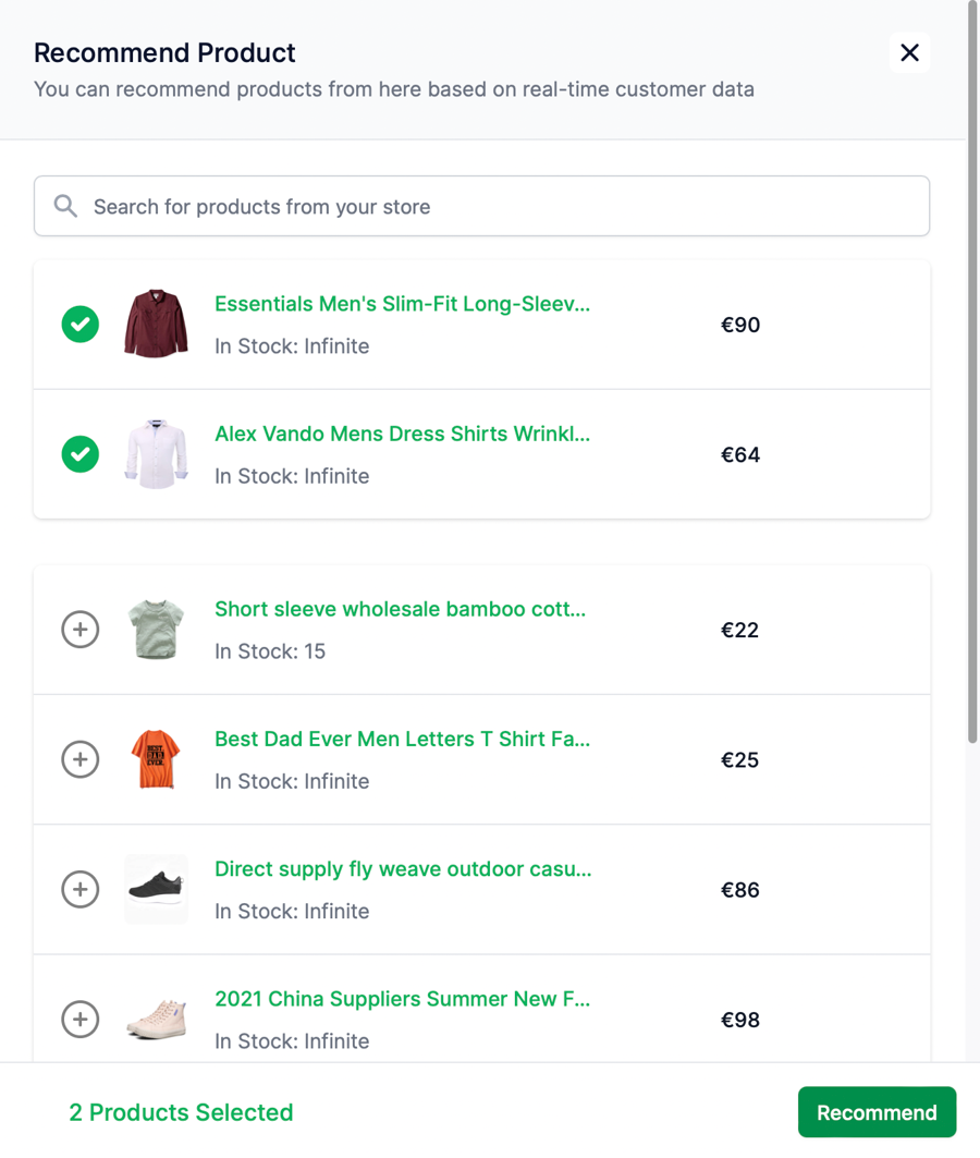 Click on the Product Recommender icon and a pop-up will appear from the right. Now, select as many products as you want and click on the Recommend button.