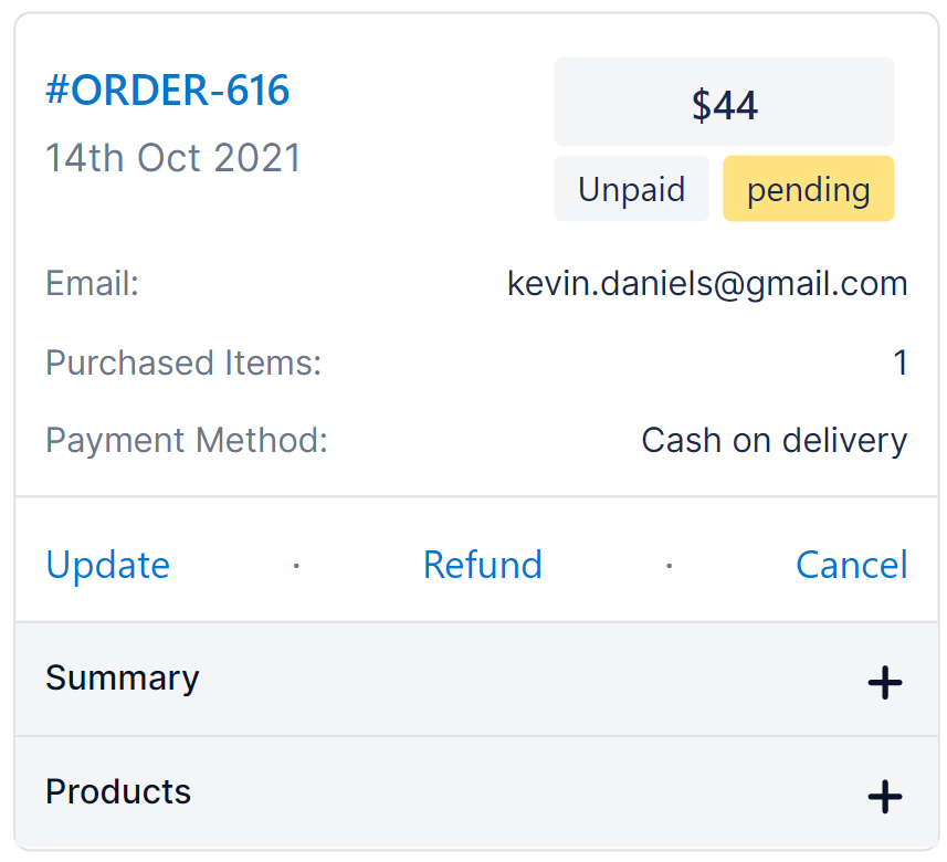 After placing an order, the order is stored in the Order History section under Customer Information. From here, you can update, refund, or cancel your orders directly from your Inbox.