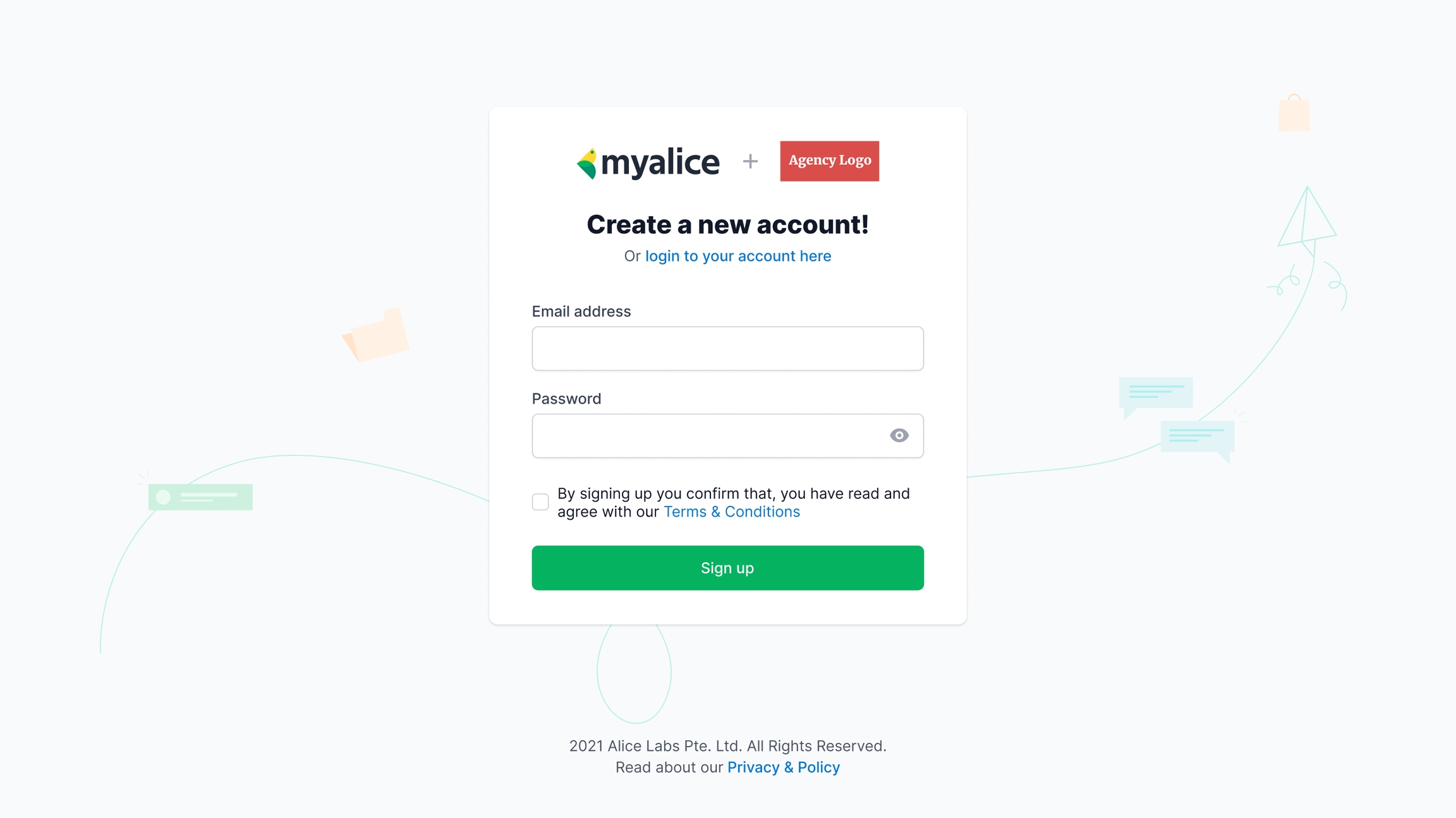 Agencies can have a custom domain i.e., your agency name.myalice.ai. Their clients can sign up from the custom domain address, and the signup window will include their logo.