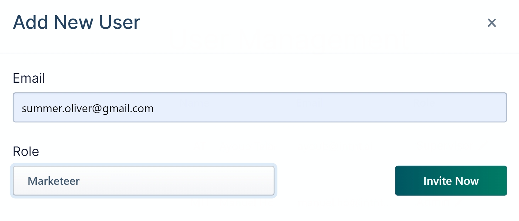 3. Click Add User on the right-top corner, insert the email address and select the Role of your new team member, and click Invite Now. The invited member will receive an email invitation.