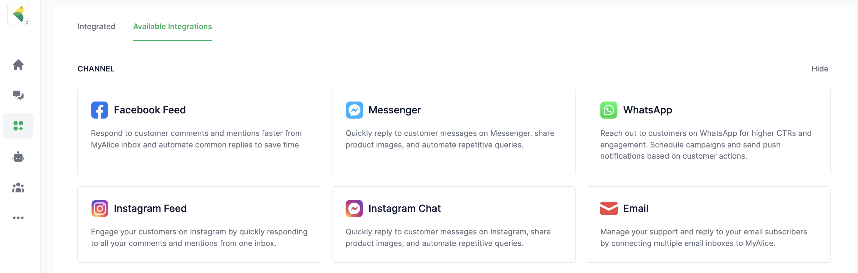 Go to the **Integration** tab on the left navigation bar to view all available and integrated channels.