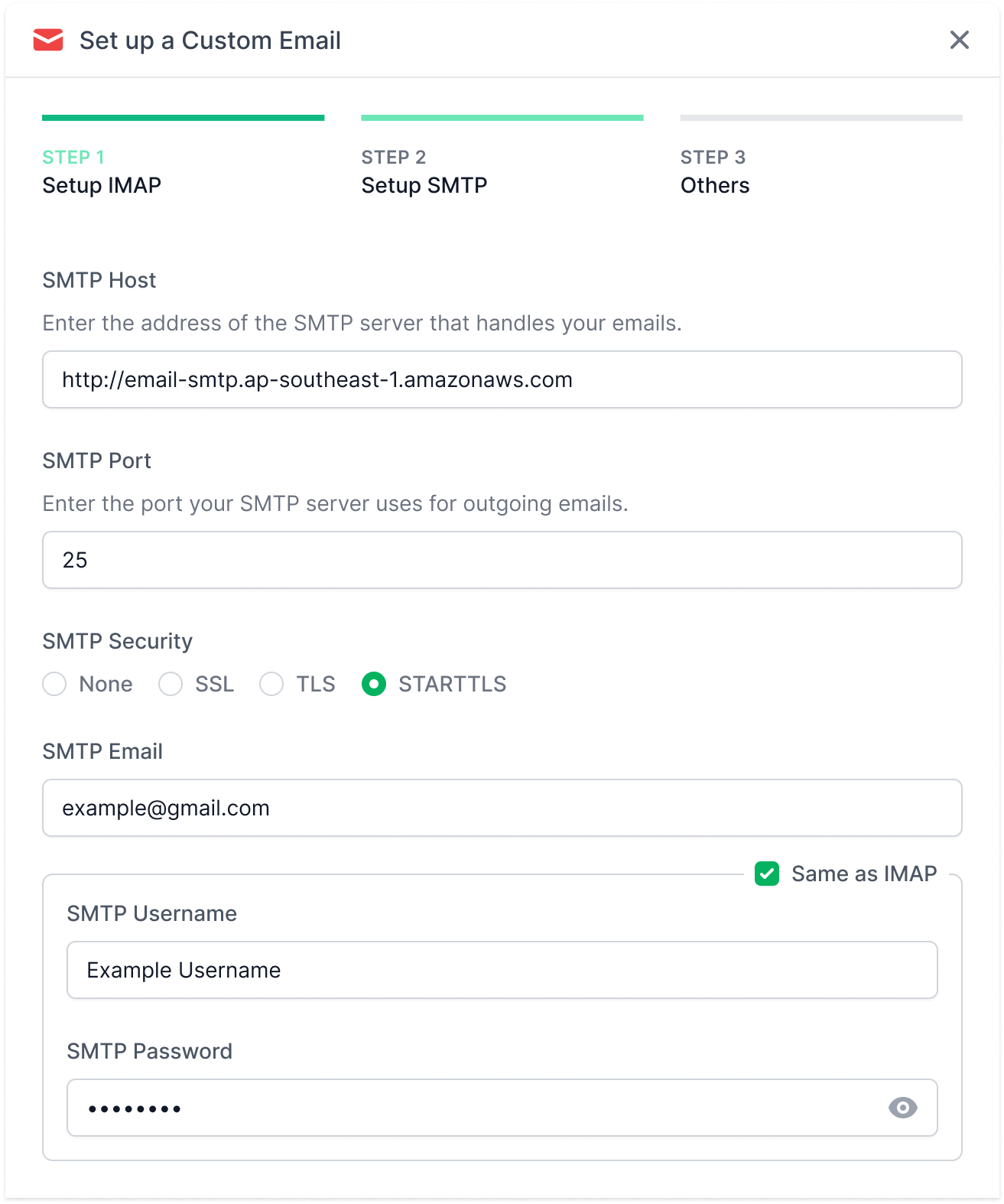 Provide your SMTP information here. SMTP is to receive emails. To know more about SMTP Host, Port and security details for popular mail servers check below.