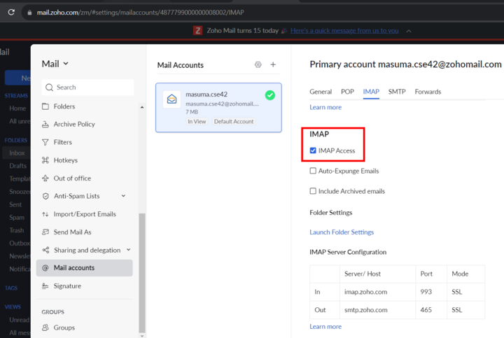 For Zoho Mail, you need to enable IMAP from Zoho mail settings shown as below:
