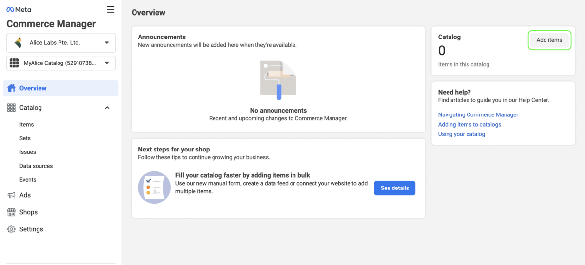 3. From a partner app (like Shopify or WooCommerce Partner app - recommended if you you're not using the partner app for other catalog like Fb shop/insta shop)