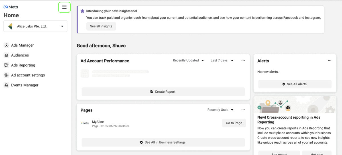 2. Select the business account, and from there, select the burger menu and go to Commerce Manager.