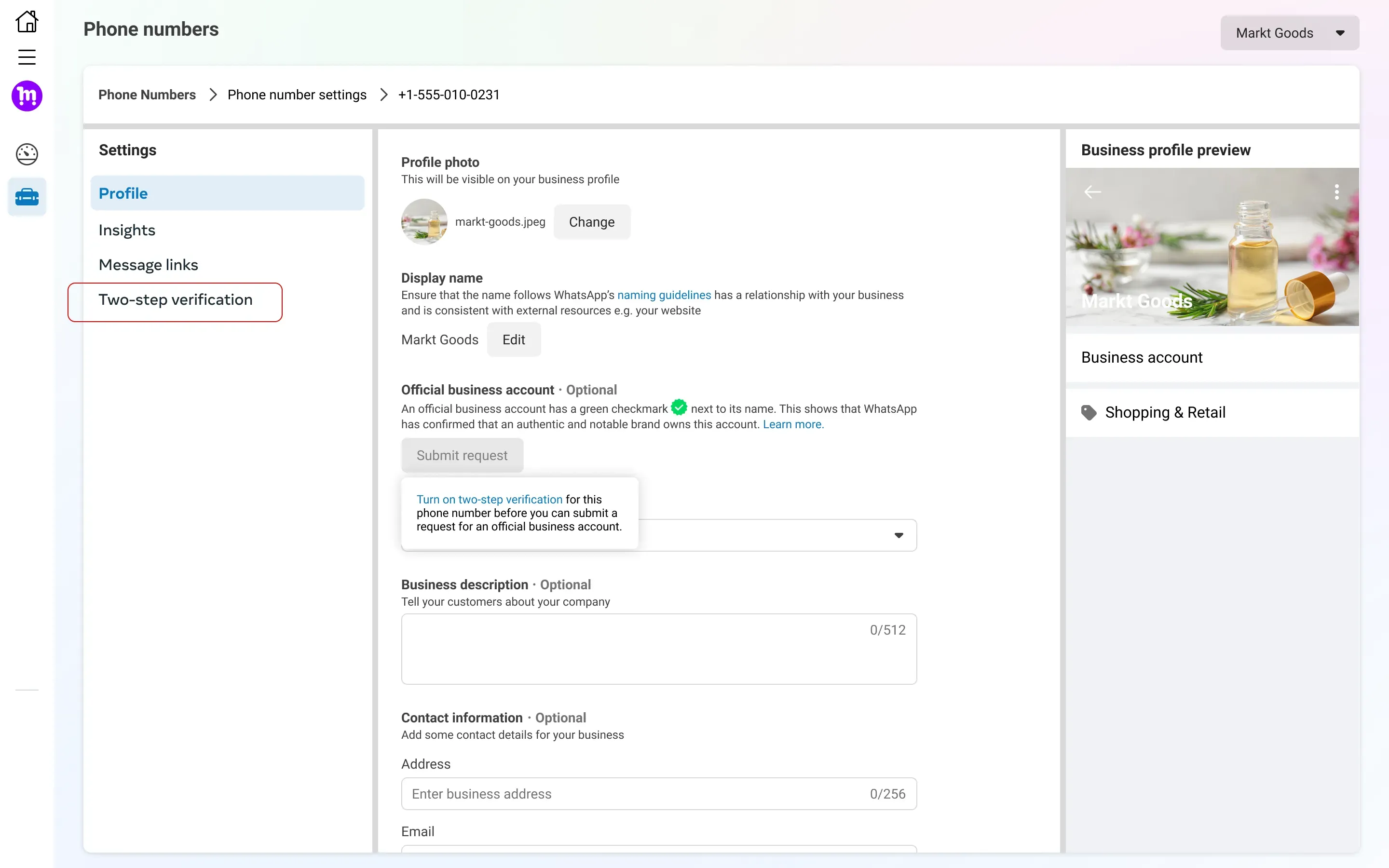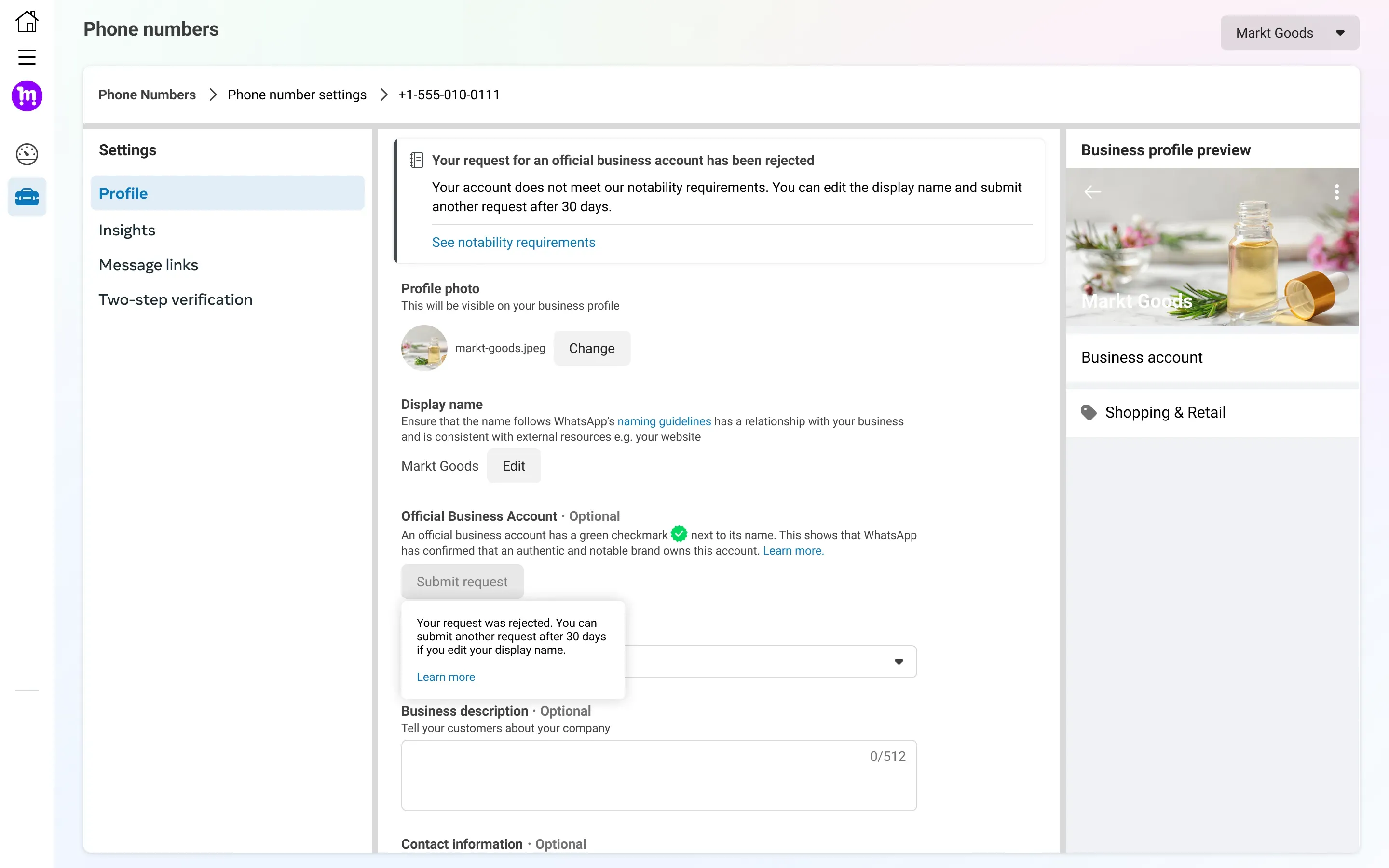 بالإضافة إلى ذلك، لا تضمن الموافقات السابقة لـ OBA داخل حساب واتساب بيزنس الموافقة على أرقام أخرى (مع أسماء عرض مختلفة) مرتبطة بذلك الحساب. إذا احتوى حساب WABA الخاص بك على علامة تجارية أصلية رئيسية واحدة وكان الرقم المرتبط بتلك العلامة التجارية يفي بمتطلبات الشهرة، يقترح واتساب تحديث أسماء العرض للعلامات التجارية الفرعية على النحو التالي: '{{اسم العلامة التجارية الفرعي}} من {{اسم بارز}}'.