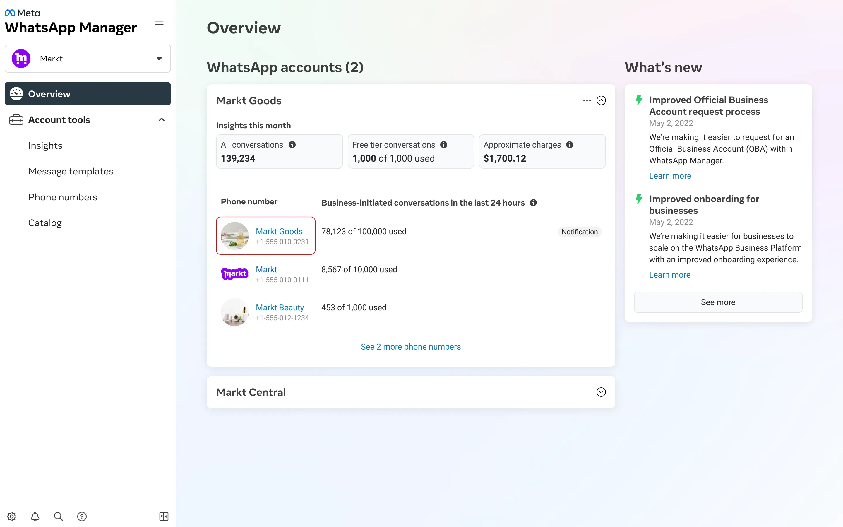 * ادخل إلى مدير واتساب من مدير الأعمال الخاص بك. انقر على رقم الهاتف الذي تريد طلب OBA له ضمن قسم النظرة العامة