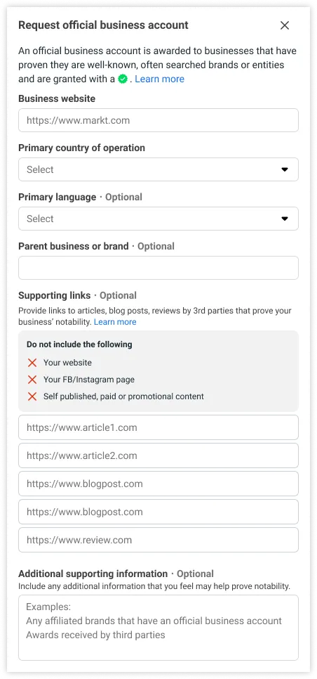 * تساعدنا حقول مثل بلد/بلدان العمليات، العمل الأصلي أو العلامة التجارية (خاصةً إذا كانت علامة تجارية معروفة جيدًا) واللغة الأساسية في فهم علامتك التجارية وأهليتك للحصول على OBA.