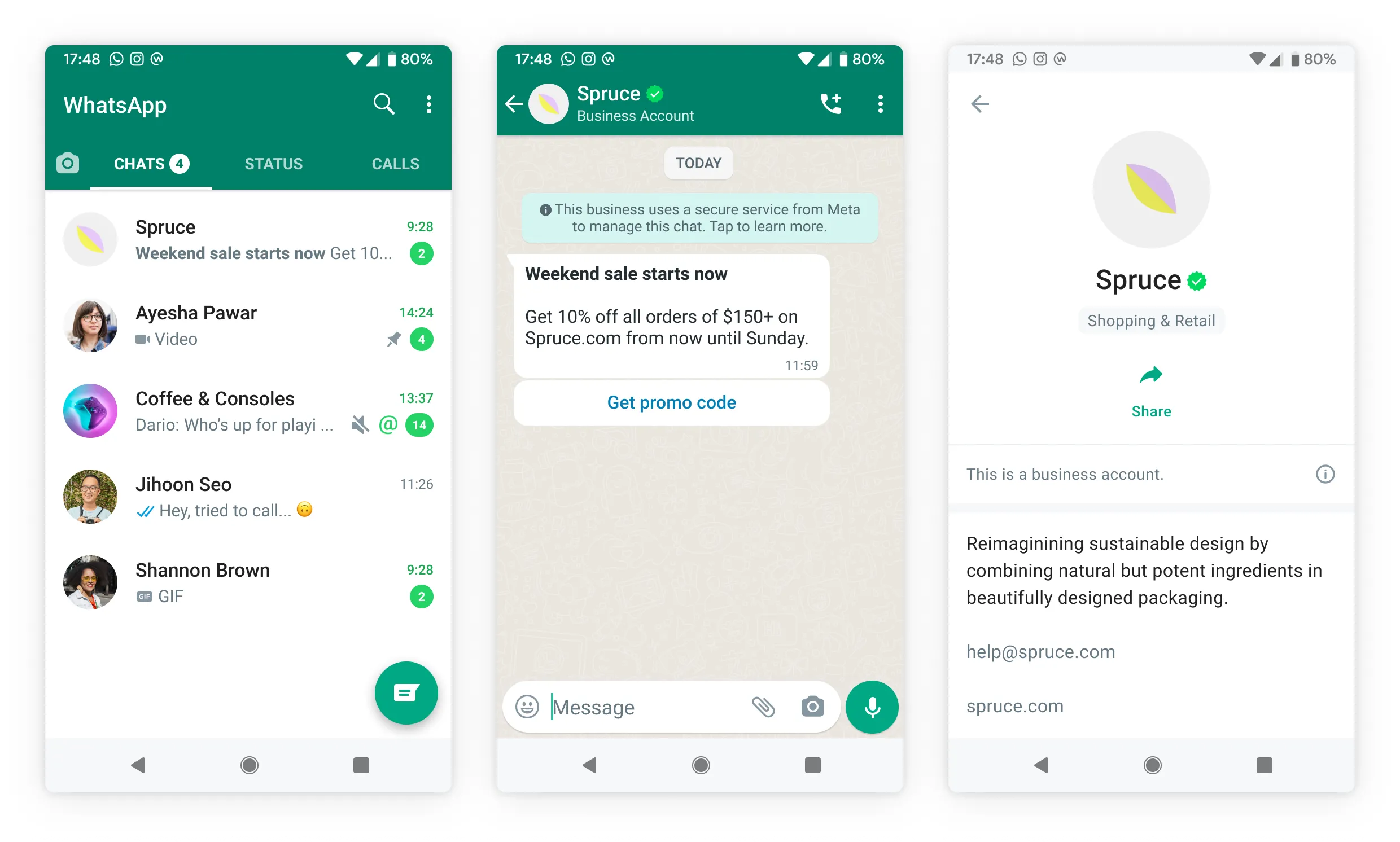 في غضون ذلك، لا يحد هذا القرار من قدرتك على مشاركة تفاصيل أعمالك. كما أن لكل رقم هاتف ملف تعريف أعمال يتضمن صورة الملف الشخصي والبريد الإلكتروني وموقع الويب ووصف الأعمال. وهذه حقول يمكنك تحريرها في أي وقت. يمكنك مواصلة التواصل مع عملائك وتوسيع نطاق وصولك إليهم على واتساب.<br>
