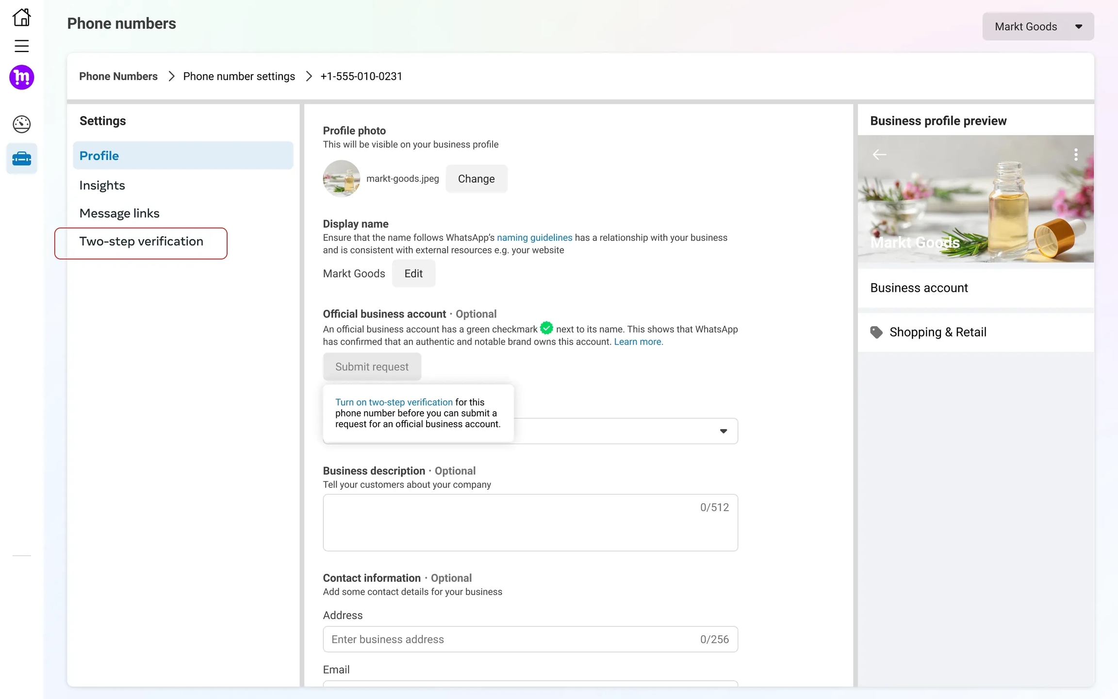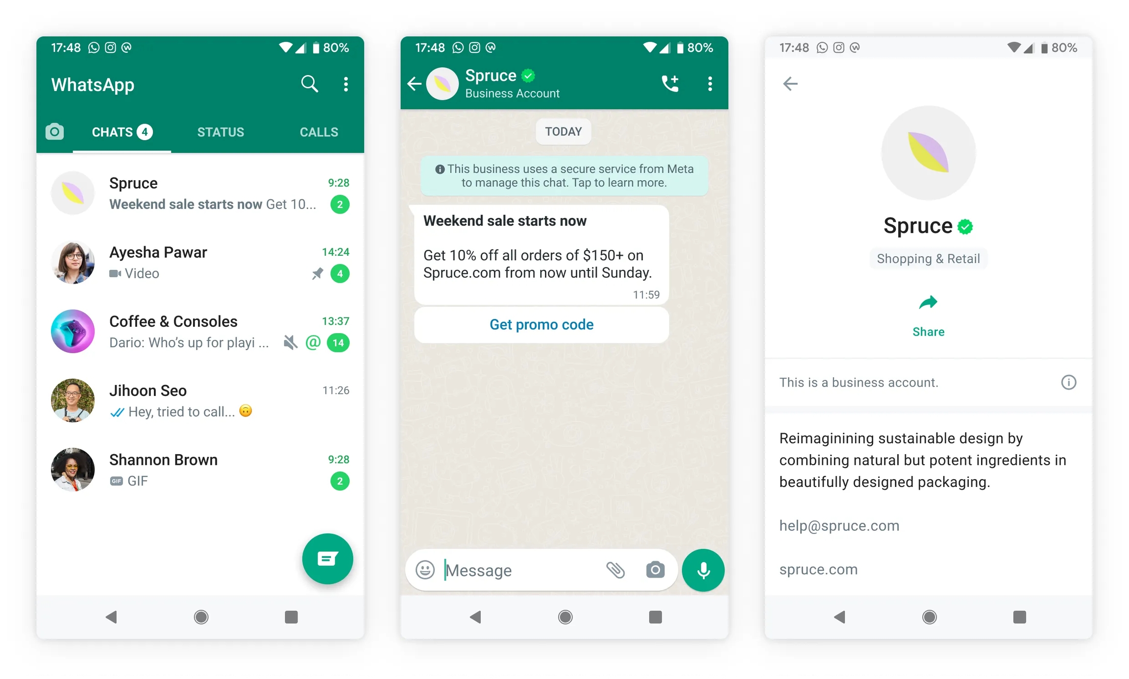 في غضون ذلك، لا يحد هذا القرار من قدرتك على مشاركة تفاصيل أعمالك. كما أن لكل رقم هاتف ملف تعريف أعمال يتضمن صورة الملف الشخصي والبريد الإلكتروني وموقع الويب ووصف الأعمال. وهذه حقول يمكنك تحريرها في أي وقت. يمكنك مواصلة التواصل مع عملائك وتوسيع نطاق وصولك إليهم على واتساب.