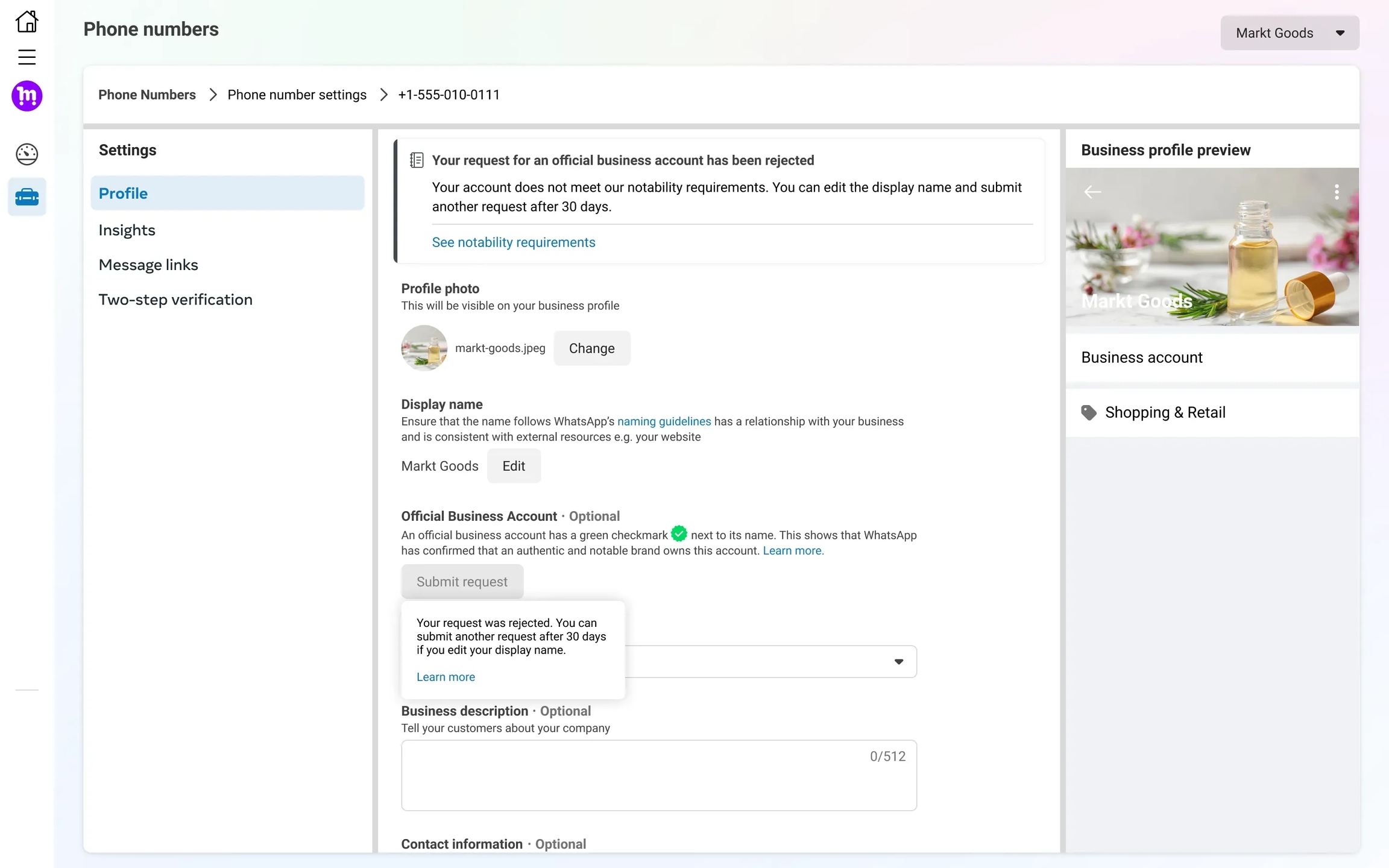 يتم إصدار حسابات الأعمال الرسمية على مستوى رقم الهاتف واسم العرض. يقيّم واتساب الشهرة لاسم عرض حساب الأعمال الذي يطلب الحصول على وضع OBA - إذا تم تغيير اسم العرض بعد تلقي وضع OBA، سنحتاج إلى إعادة تقييم اسم العرض الجديد من حيث الشهرة والامتثال لاسم العرض.