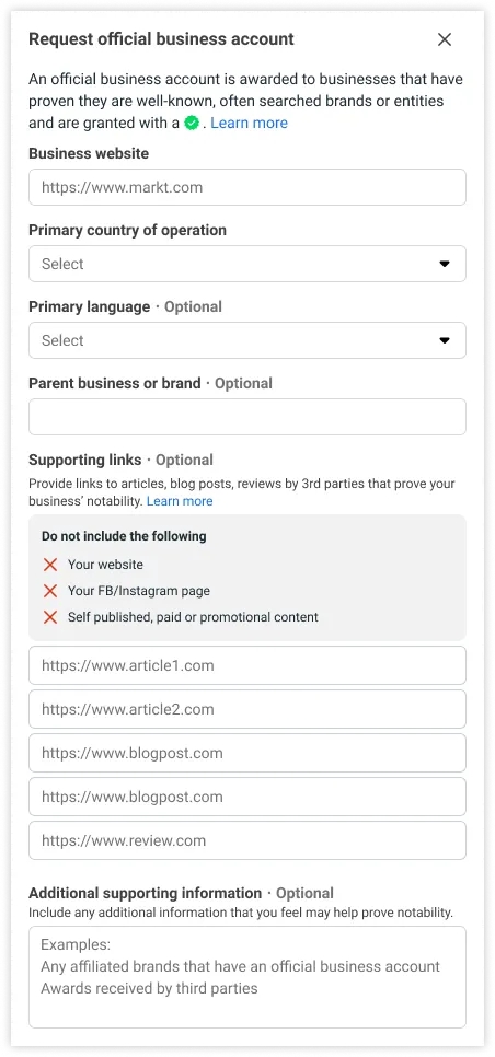 تساعدنا حقول مثل بلد/بلدان العمليات، العمل الأصلي أو العلامة التجارية (خاصةً إذا كانت علامة تجارية معروفة جيدًا) واللغة الأساسية في فهم علامتك التجارية وأهليتك للحصول على OBA.