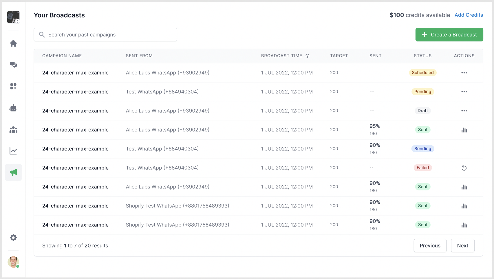 لديك قيد على عدد رسائل البث التي يمكنك إرسالها يوميًا. في البداية، بفرض أن مدير الأعمال الخاص بك موثق، سيكون لديك حق الوصول إلى 1000 رسالة يوميًا. مع بدء البث بشكل متكرر، سيزداد المبلغ تدريجيًا إلى 10,000 وما أكثر ويمكن أن يصل إلى رسائل غير محدودة.