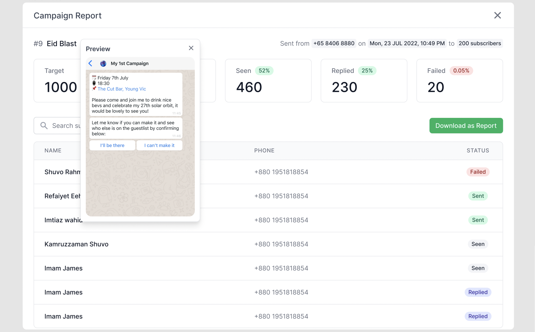 الخطوة 10 : وانتهيت من إنشاء بثك! راجع قسم البث مرة أخرى، وانقر على أيقونة الشريط بجانب بثوثاتك وسترى تقارير مفصلة حول بثك حول عدد الأشخاص الذين تلقوه وعدد من ردوا أو تركوه كـ مرئي. يمكنك حتى تصدير التقرير كملف CSV للرجوع إليه.