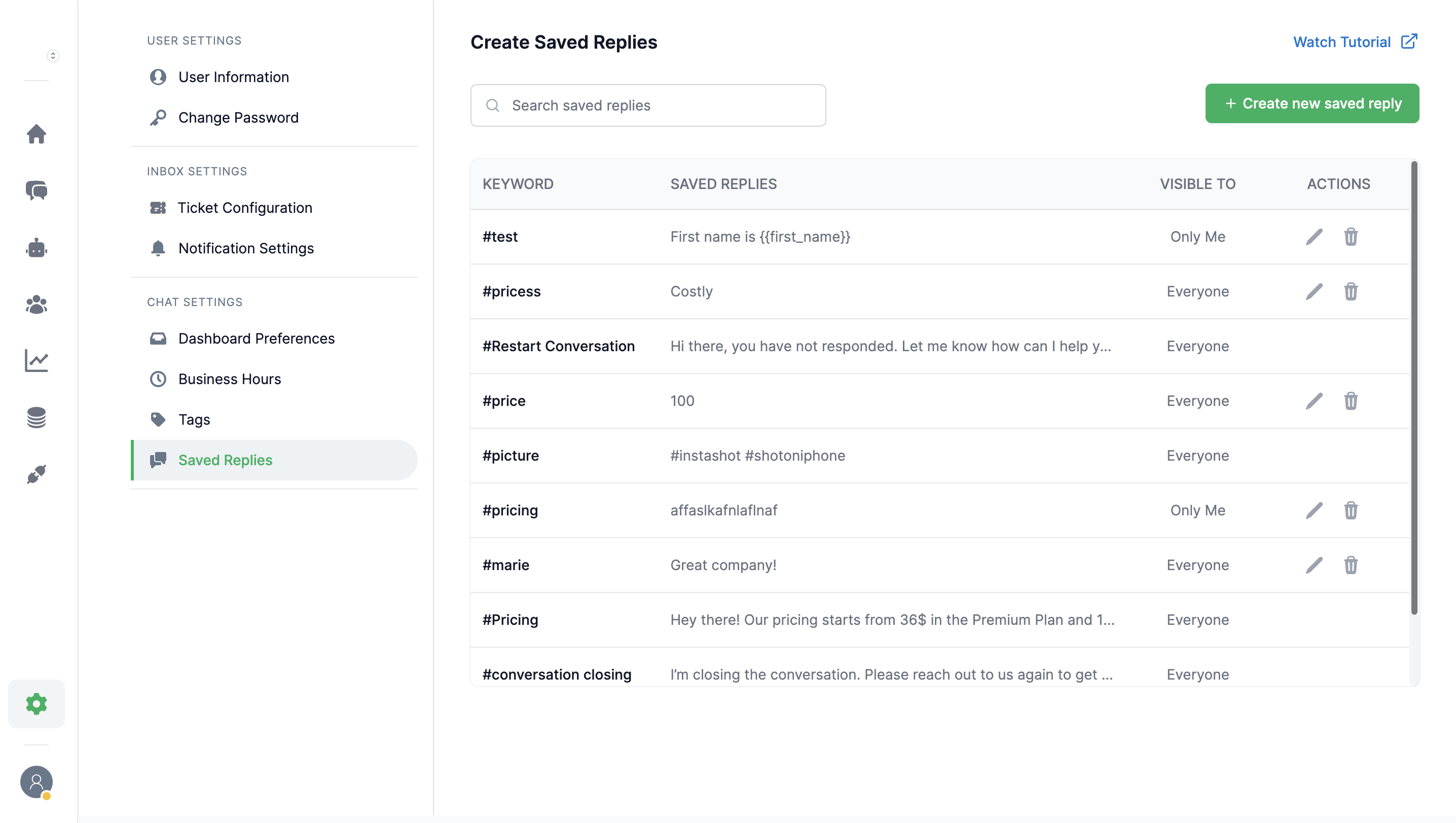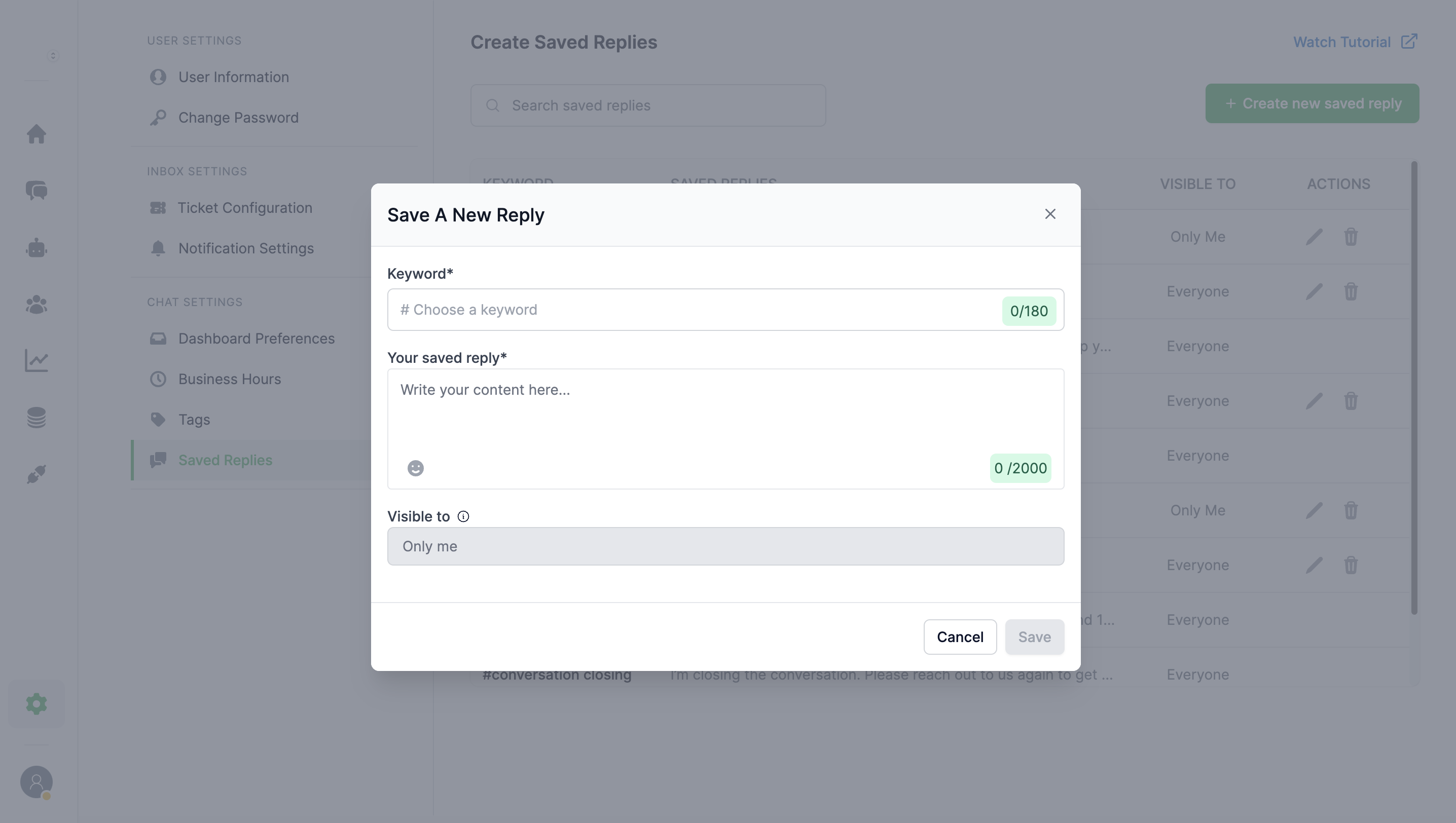 Please note that the option to create and edit saved replies is available to Admin and Supervisor roles only. Agents can only access the saved replies that have been created and is accessible by everyone.
