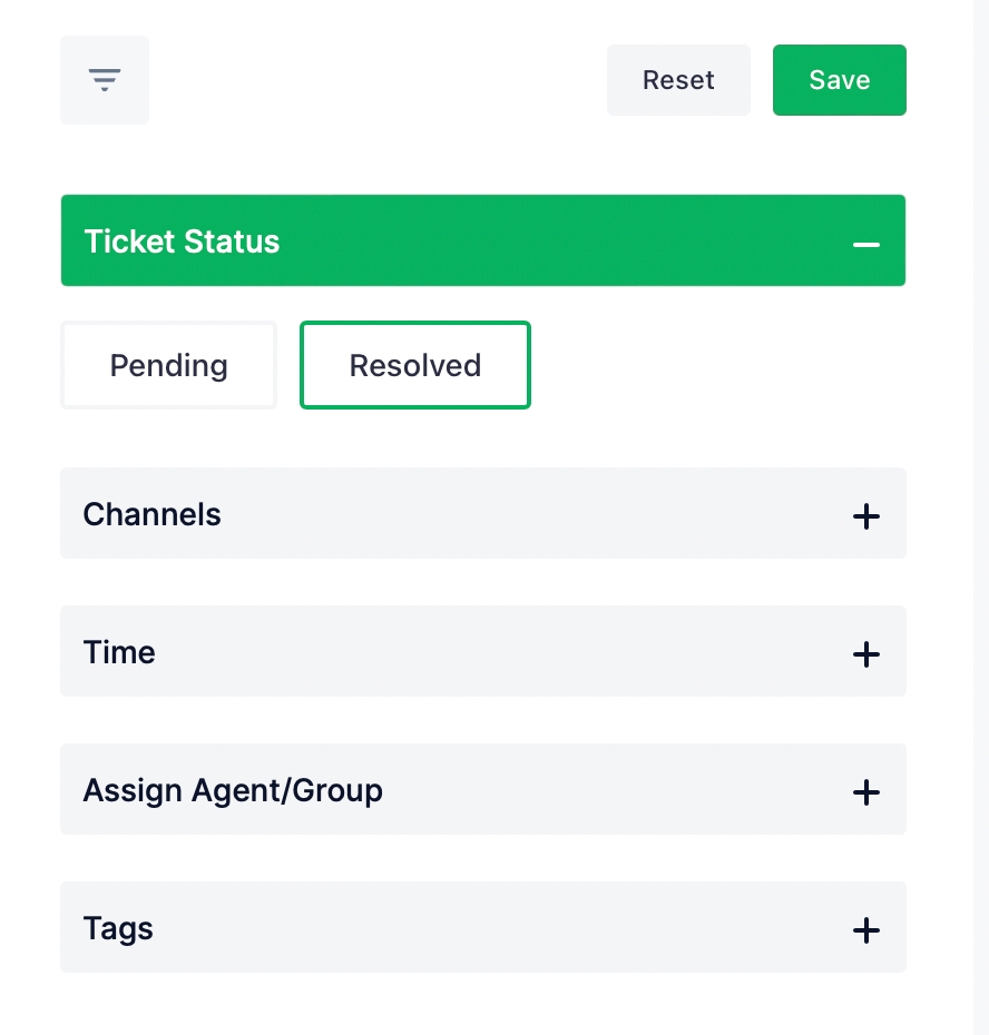 2. A window will appear from the right side. Select Resolved under Ticket Status and click Save. This will show only the resolved/closed conversations in your account.